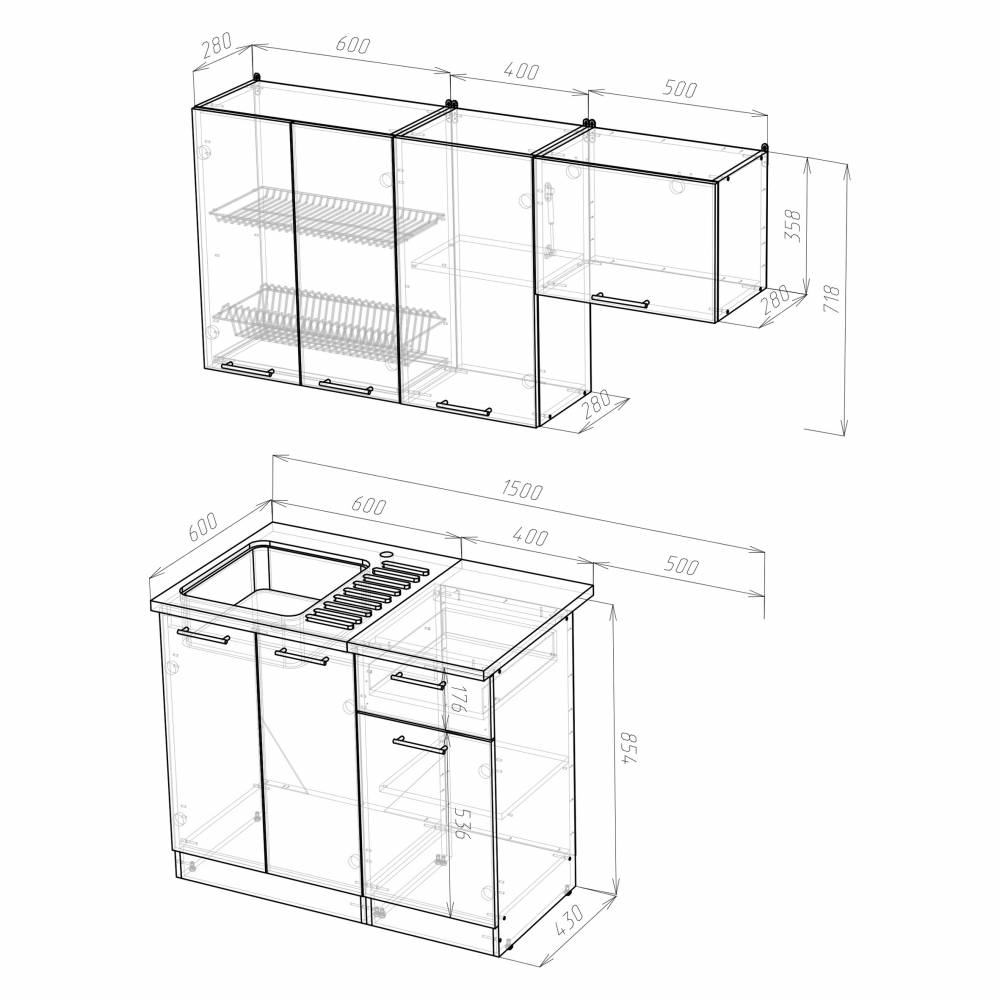 Ширина: 1500 мм; Глубина: 600 мм (со столешницей)