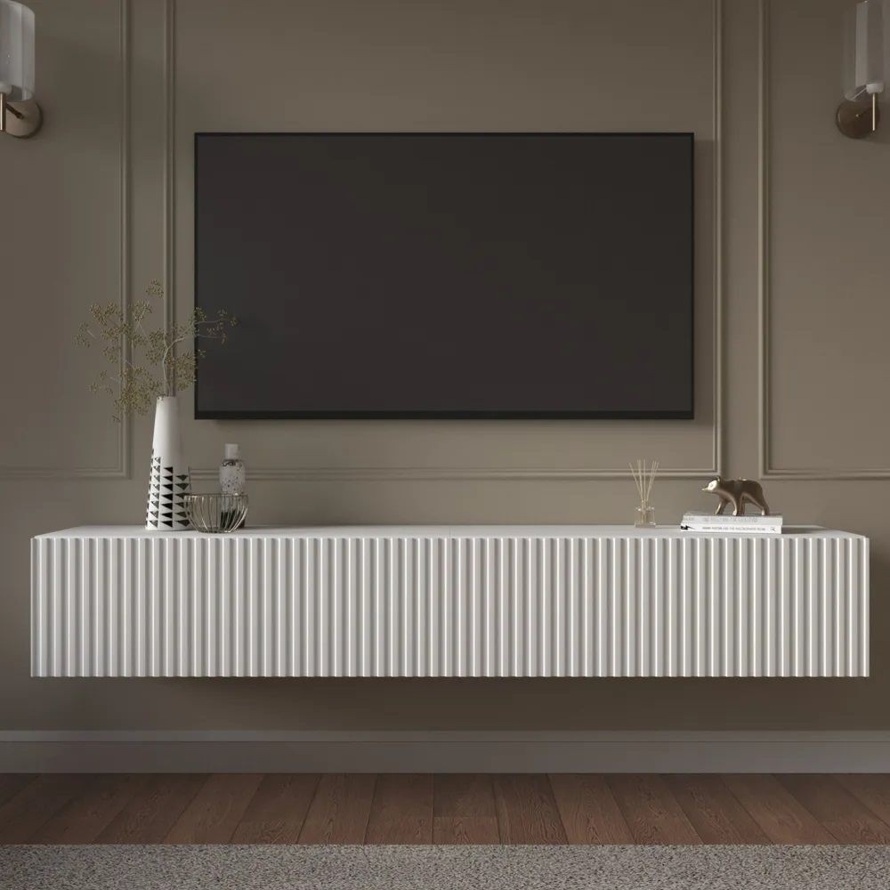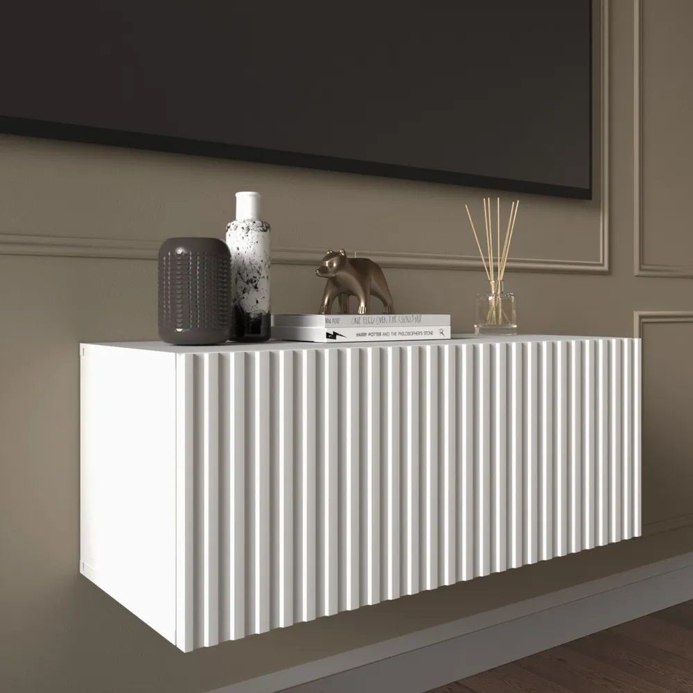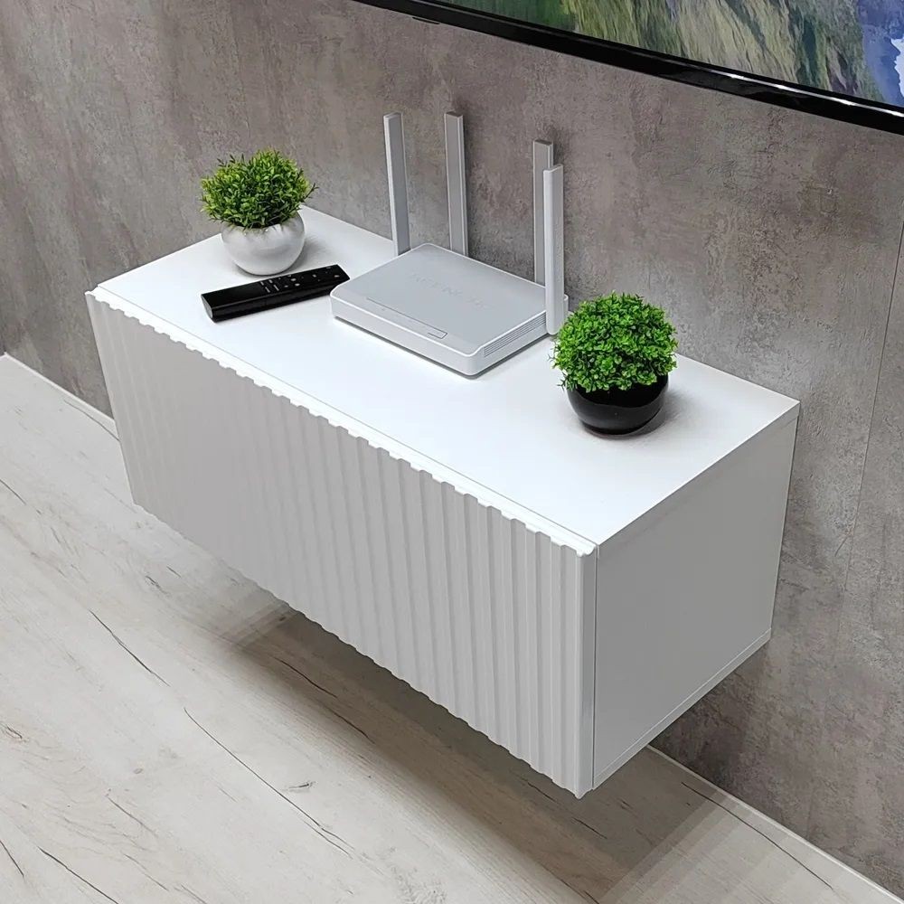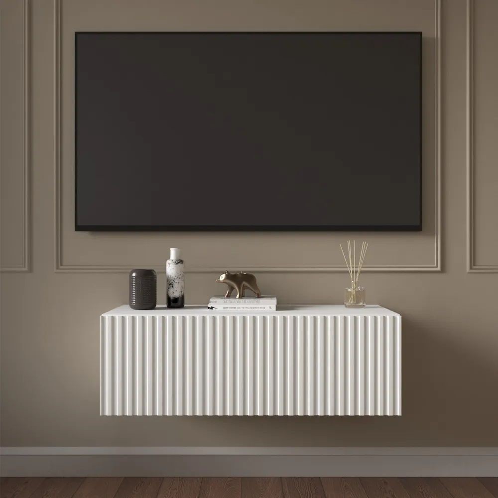 Благодаря своей компактности тумба под ТВ подвесная поможет сэкономить пространство, избежать ощущения загромождённости гостиной, спальни или детской комнаты, а рифлёный фасад будет акцентировать