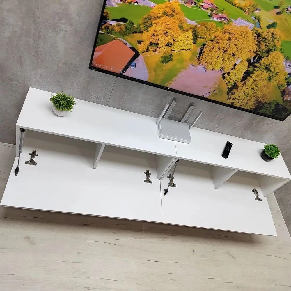 Вы можете подвесить одну тумбу под ТВ рядом с другой, чтобы получилась одна длинная тумба под телевизор в стиле лофт, длиной 180 см.